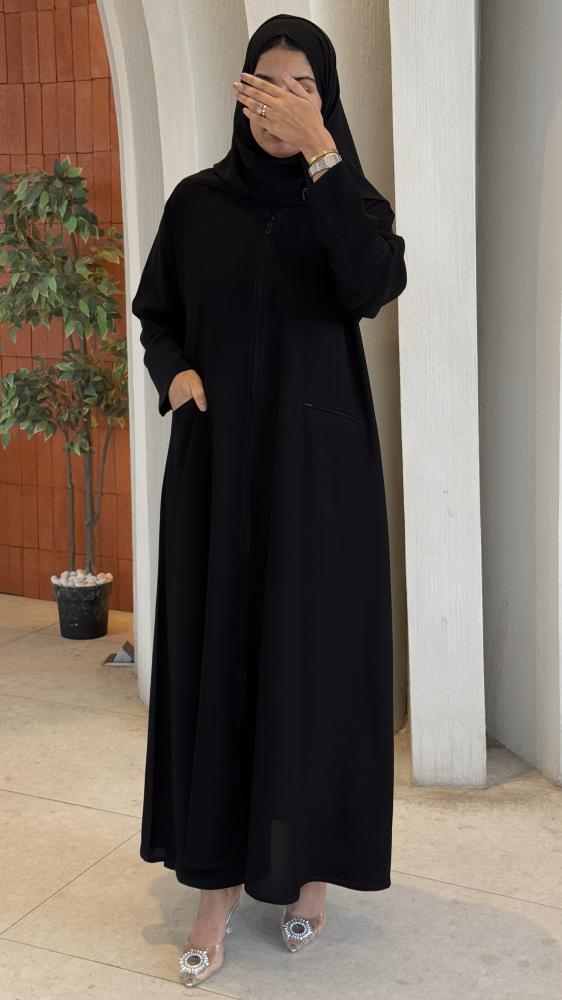 المنتج هو عباية بتصميم أنيق ومميز، تحتوي على سحاب أمامي مركزي يمتد من أعلى الصدر لتسهيل الارتداء. بالإضافة إلى ذلك، يوجد سحاب جانبي مخفي عند منطقة الخصر، مما يضفي لمسة عملية لتخزين الأشياء الصغيرة بأناقة وسرية. اللون الأسود الكلاسيكي يمنحها طابعًا راقيًا